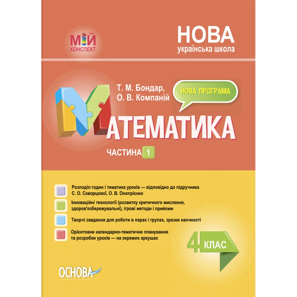 Посібник містить орієнтовне календарно-тематичне планування та розробки уроків математики у 4-му класі Нової української школи, складені відповідно до вимог нового Державного стандарту початкової освіти (2018) за Типовою освітньою програмою авторського колективу під керівництвом О. Я. Савченко. Розподіл годин і тематика уроків відповідають змісту підручника С. О. Скворцової, О. В. Онопрієнко (Математика : підруч. для 4 кл. закладів загальної середньої освіти (у 2-х частинах) : Частина 1. — Х. : Видавництво «Ранок», 2021). Конспекти уроків, різноманітних за формою проведення, побудовано з урахуванням основних положень Концепції «Нова українська школа», на засадах компетентнісного, діяльнісного підходів, з використанням елементів інтеграції, інноваційних та здоров’язбережувальних технологій, інтерактивних методів та прийомів навчання, сучасного обладнання як складової нового освітнього середовища.
